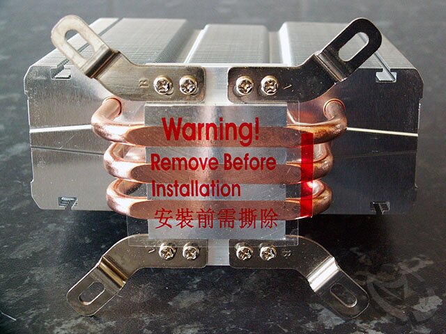 Moving to the base, we can see a warning sticker that protects the base before use. Once this is removed we can see that Evercool have once again used a Direct Touch style base, which is to say that the heat-pipes of the cooler make direct contact with your CPU’s heat spreader When we reviewed the Transformer 4 Plus, we did notice that there was a slight gap between some of the pipes and the base. The Transformer 3 however has a near perfect finish in this respect. There are no gaps to the naked eye, and you can barely tell the difference between materials when you run a finger over the base. There are a few machine swirls but the base looks to be finished rather well.