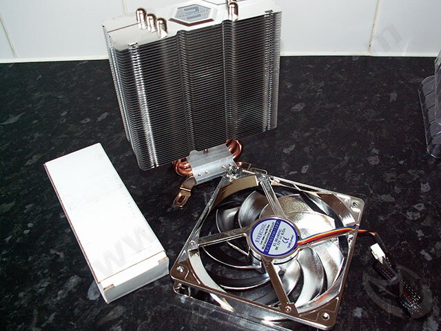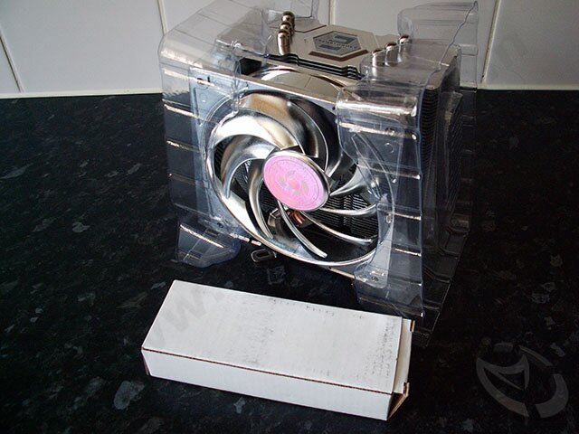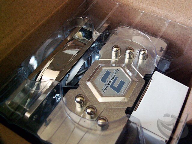 Opening the box, you are greeted with the top of the heatsink and its Transformer 3 logo. Everything inside is held within two clear moulded plastic supports.