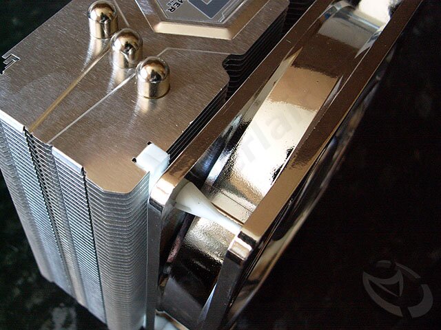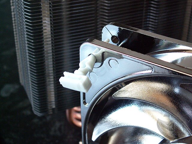 A clip goes through the corner mounting holes on the fan, and then the fan in turn is mounted on the four corners of the heatsink. Once mounted, you can see there is a slight indentation in the heatsink fins around the central area, perhaps to allow for a little movement in the fan dead zone.