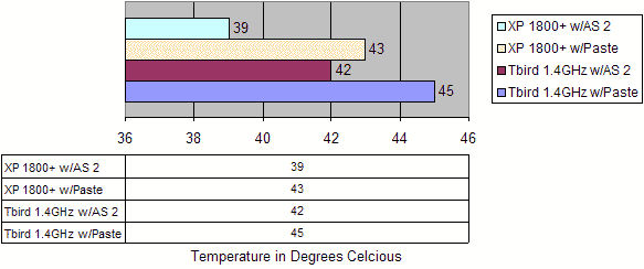 No doubt about it, thermal paste quality makes a difference, and the Arctic Silver 2 kicks mucho butt. Now, I'm going to be honest here, and I really didn't think AS 2 was going to make a difference. What I expected was that temperature would remain about the same, but unlike regular pastes which breaks down over time, and needs to be reapplied, AS 2 would retain it's thermal properties longer. In no way did I expect to actually see such improved temperatures, but I did. If it were 1 degree, I'd figure no big deal, but temps dropped anywhere from 2C to 4C.