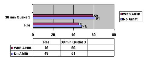 After a session of Urban Terror, where I yet again failed to kill anyone in half an hour, the Airlift managed to keep the video card about 2C -3C lower than before. Nice results for sure, considering no major hacking of the stock heatsink was needed. Why the surprise on my part? I really didn't think the Airlift would do much since it's not slapped right on to the PCB like a heatsink would.