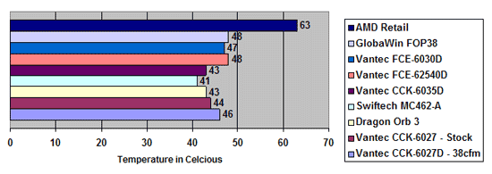 The only factor I can see affecting the scores, is the Lian-Li aluminum case. I've determined the margin of error to be approximately 2C degrees. Temperatures were gathered using VIA's Hardware Monitor. As usual, I'll present it graphically in comparison with past coolers.