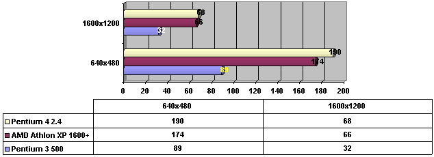 At the lowest resolutions, the differences are slight between the faster processors. Given the close results, the Pentium 4 still holds a lead over the Athlon 1600+, which would indicate that the CPU is the still the bottleneck for ATI's latest. I think it's pretty obvious that the Radeon 9700 should not be paired up with a 500MHz CPU.