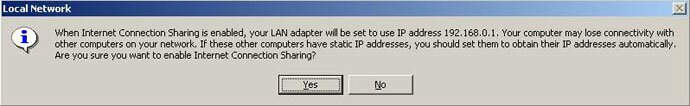 Now this little popup is basically telling you that it will statically assign the IP address of 192.168.0.1 to your other NIC so that it can act as the gateway for all other computers on your network. You are going to want to click "Yes" here to go ahead with sharing ICS. (A word of note here, you might want to check and make sure you don't already have an IP address configured into your other NIC so that everything will flow smoothly during this).