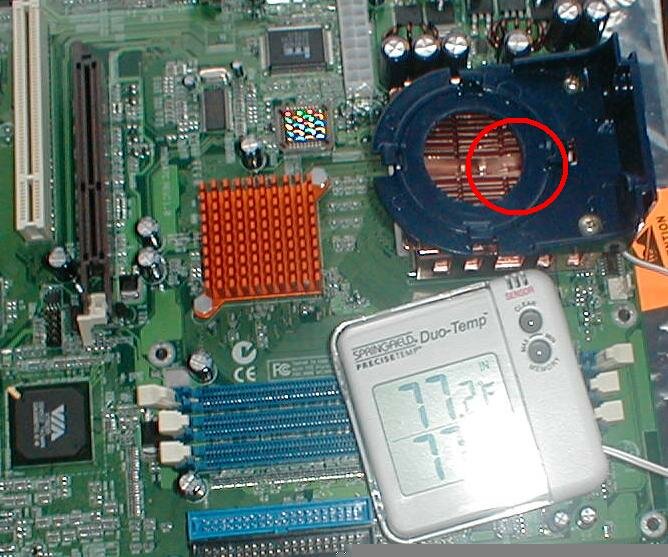 First, I installed the bilge pump mounting bracket onto the heat sink. Why a bilge pump? It only cost 10 bucks and cranks out 500gph! Also, it runs on 12v DC...no extra AC cord. It will suck cold liquid to the CPU and blow the hot liquid away to be circulated. I also installed an extra thermometer under the pump bracket to monitor fluid temperature.
