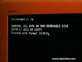 This will do a quick format. Either way, you'll get a warning that your data will be wiped out and you can't undo a format. This isn't really true, since there's software available to recover data lost in a format. It's a pain in the ass though, so make sure your stuff is backed up. Uh, ...also notice that I typed ".\format". The "." before the "\" is just how I say that the "." is simply the root directory you're in. This most likely will be a: drive.
