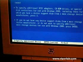 Setup will continue, and you'll be presented with a blue screen. Note the text on the bottom asking if you have a SCSI or RAID controller, to press F6. Now, whether or not you need to do anything depends on your hardware. Older, pre-2000 hardware likely will be detected, but if your hard drive(s) is configured in a RAID array, or if your disks are dependant on a SCSI controller, you will likely need to press F6. You only got about 5 seconds to decide, so make sure you got your drivers handy. As far as I know, you will need these drivers on FLOPPY disk. Yes, the old moldy 3 1/2" diskette. If anyone knows of another way, feel free to drop me a line, otherwise you'll have to do it this way.