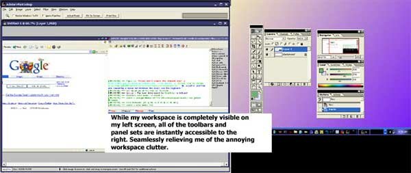 You can see, taking photoshop as an example, how those tool sets are moved over to the secondary display. That's where they belong, not blocking the workspace to the left.