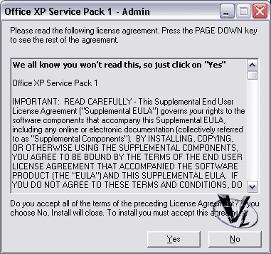 You can run the command "x:\oxpsp1a.exe" from the "Run" menu, where "x" is equal to the drive letter where you downloaded the admin install, or just double click on the install file. This will pop up the EULA for the update. Click "Yes" and continue...