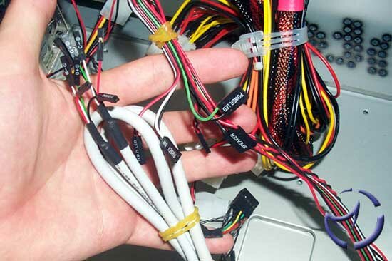 Here was my computer in its usual form. The parts all rested on a Lian-Li PC62 motherboard tray, and I ran it out of the case to get cooler temps. Before I could install the motherboard, I had to move this big gang of cables out of the way. All the power cables, the front FireWire/USB, and sound cables were all neatly wrapped, but still all had to be moved out of the way so I could get the motherboard inside the case. Brining it up again, if the Sonata had a removable motherboard tray, this wouldn't have been nearly as big of a problem.