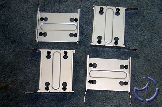 I repeated the task for my Promise TX2 raid card, and the Geforce 4. After the add-on cards were all installed I moved onto installing the harddrives. This was a much easier task to do. All of the harddrive trays have rubber grommets absorbing vibrations from the drives, and all the drive trays require no tools to install or de-install. The screws are specialized so that they cover the entire rubber grommet. I figured that this was to ensure that the screws wouldn't chew into the rubber. The second picture shows the harddrive with one screw off so you can see the full grommet and how the screw covers it entirely.