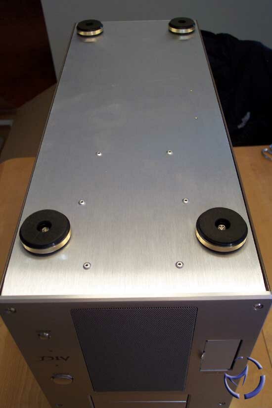 Taking a cue from home audio equipment, there's a nice gold trim around the 4 feet on the bottom of the case. I do question the colour choice though, as being a silver case, a silver trim would be a better colour match for the rest of the case. The feet are fairly spongy, and do a pretty good job at keeping the case from slipping around.