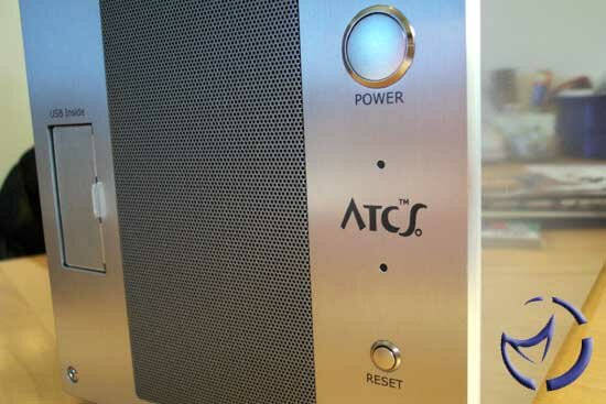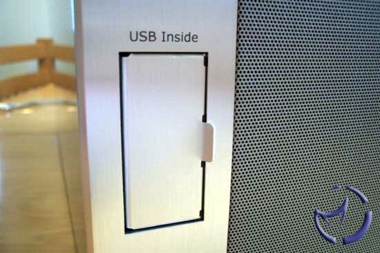 The power button and reset button are nicely recessed on the right side. The power button is a little "squishy" for my tastes, but that's a minor complaint on my part. On the left of the vent are the USB 2.0 ports. Personally, I don't like the idea of USB ports that "show" on the front, so the spring door to cover the ports is nice. I'm not sure if it was our sample or if it'll be a common issue for all of the production 201As, but the spring door doesn't really lock in an open position. A couple of times, it just swung shut, bending the cable to my USB device. No damage was done, but you'll need to take some care with the door.