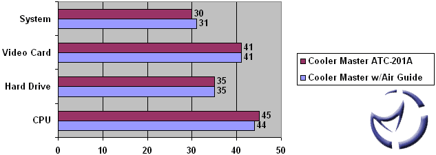Testing the Cooler Master with the Air Guide enabled netted some interesting results. System temperatures actually increased slightly, but CPU temperatures did lower by a small margin. What is probably happening that the CPU fan is configured to draw air into the heatsink, and the Air Guide is channeling cooler outside air on to the heatsink. The reason we're not seeing a more drastic drop in temperatures though is because the Air Guide does not reach the motherboard, thus not cutting the heatsink off completely from the rest of the components. The increase in system temperatures is probably the result of the Air Guide obstructing some of the air flow to the rear vent, though I think this rise in temperature is worth the drop in CPU heat.