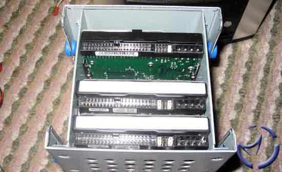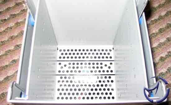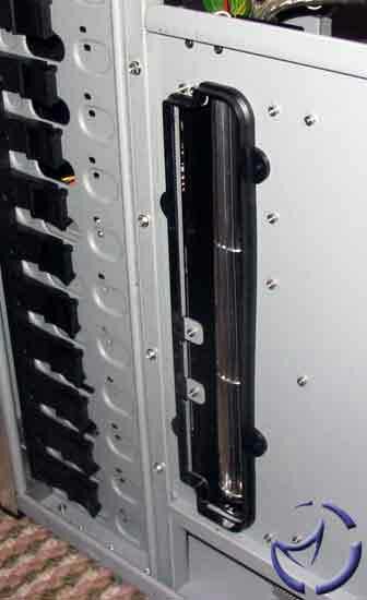 I found it interesting that the rails were really just attached to a panel that wasn't even screwed onto the harddrive cage. Instead it was just kept in by being pressed on while it is installed. You'll note the big blue rubber grommets that help keep HD vibration down.
