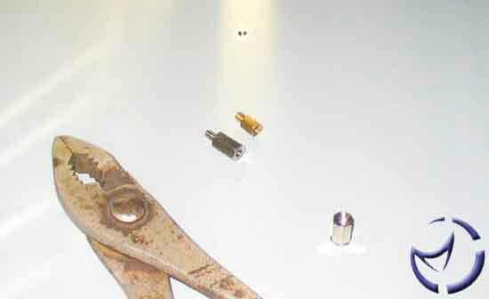 After that, simply install the standoffs. I thought this required a picture to show you the massive size of the standoffs that come with this case. The top one is a standard standoff from an Antec case, and the bottom one is the massive one for the Stacker. The pair of pliers is what I used to tighten them to the max, and then also used for size comparison.