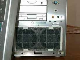Looking closer here, we can see the fan intakes. There are two 80mm fans hiding back there. They are pretty decent fans, and they're spec'd to pull in 50cfm of air each. Dust would normally be an issue, but luckily, the engineers at Lian-Li added a washable fan filter. A nice touch indeed. The fans can be noisy, though they're easy overpowered by my Delta 60mm fan. You can pop the face plate off, and set the fans to spin slower (sorry for the blurry pic). You'll get less air, but it's supposed to be quieter. IMHO, it's more of a gimmick, since the fans don't seem to be quieter.