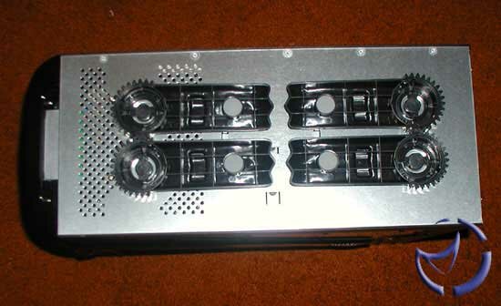 Also I noticed that a motherboard barely out of ATX spec would not fit on this tray, due to the plastic handle on the motherboard tray. I wouldn't recommend any server boards in here. As you can see, with an a7n8x deluxe installed, looking down at the motherboard installed on the motherboard tray, the motherboard tray isn't visible at all! Only the green handle is visible on the side.