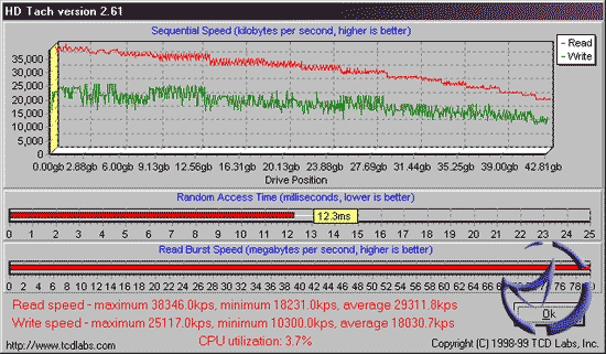 Here at Viper's Lair, we use HD Tach to gague a hard drives capabilities - I used an IBM 65GXP to test out the performance of the round cable versus the ribbon cable. The above pictures show that there is an extremely small performance drop when using the rounded cables, but the rounded cables also had a higher transfer speed (by 2 KB/sec). The truth is that read and write times are comparable, and that these differences in score do not represent one cable being better than the other - the fact that the cables perform almost equally though, does stand. The difference in CPU usage is also negligible.