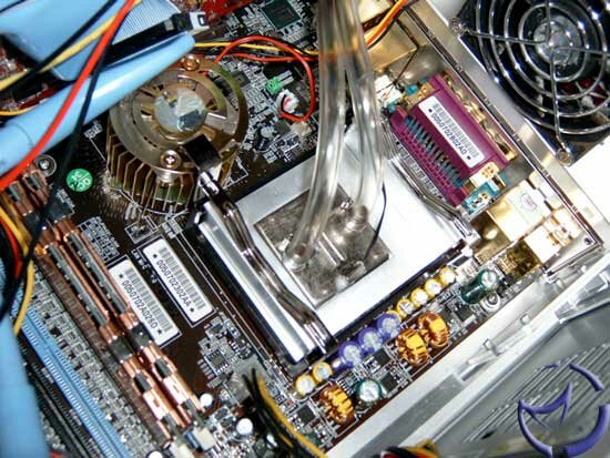 I found the thermal paste to be quite difficult to work with. It was much more viscous than Arctic Silver as well as the generic paste you find in a blister pack; it was very hard to spread, and would bunch up often. Just a warning here, after testing the Hydrocool on my P4, I went to take the Hydrocool out of the system so that I could get my K7 temps. I lightly tugged on the waterblock after removing the retention mechanism, and the waterblock stuck to the CPU. I pulled a little harder and the waterblock came off.