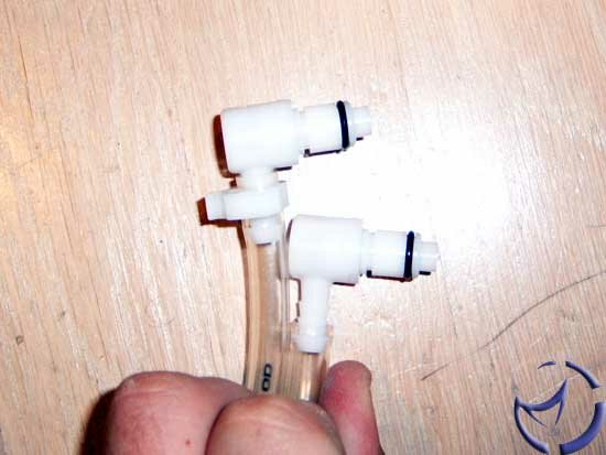 Then attach the hose adapters, they fit snugly with the tubing, and the plastic hose clamps are a cinch to click closed. However, the 90° adapters will not fit through a PCI slot. If for whatever reason the hoses need to come back through the PCI slots (if you need to put a different clip on the water block, or want to change systems.) To get the hosing back through the PCI slots the 90 degree connectors must be cut off from the tubing, and then re-inserted into the tubing once it has been re-routed.