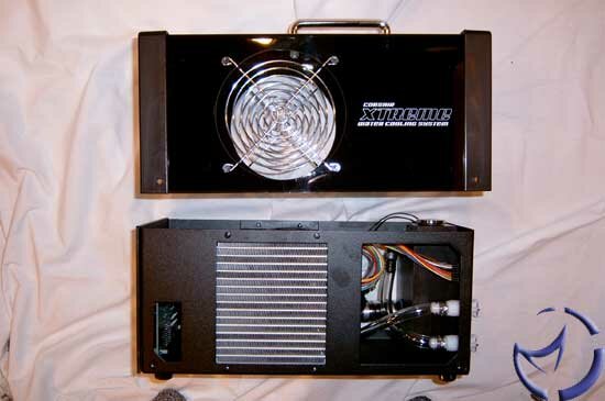 Here we can see the Hydrocool's radiator, as well as the connectors for the hoses and the PC connector. There is only one fan in the Hydrocool unit, and it is mounted to the radiator, thereby reducing the total amount of noise that the Hydrocool can possibly create.