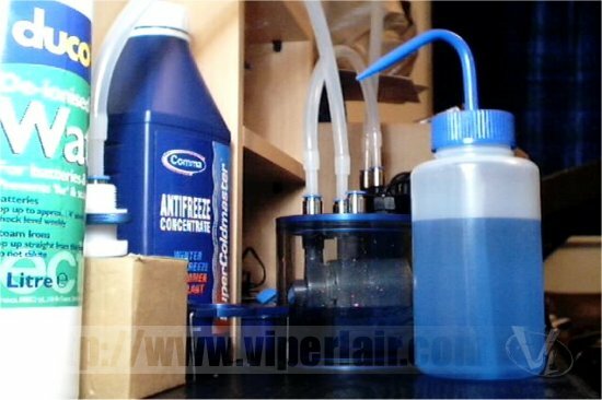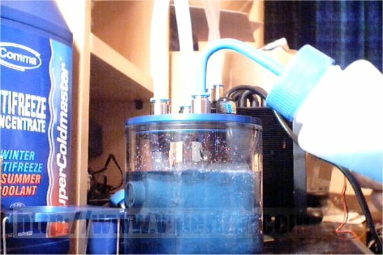 Once that's done, fit the system together with the pipe work in the correct order i.e. radiator outlet to pump inlet, pump outlet to waterblock inlet, waterblock outlet to radiator inlet. Using the supplied water bottle fill the system up with distilled water and some form of antifreeze or water wetter mix and fire up the pump. As the water pumps around just fill the reservoir as needed. After a few minutes the air in the system will be expelled and your ready to go.