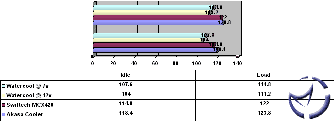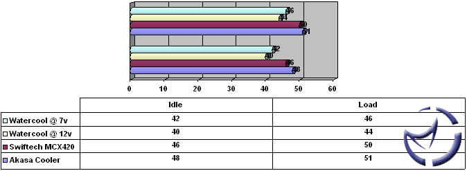I've tested the watercooling kit under both 12 volt and 7 volt operation, as although this isn't the way it is supplied, it is something that some users will want results on considering the noise generated at 12 volts. For idle settings, Windows was booted up and left for 15 minutes and a reading taken. For load settings Quake III Arena was left running a looped Timedemo for an hour and readings taken. This was done 3 times and the average temperature taken for each. Room temperature was maintained at 26C. In the case of the aircooling, the side of the case was left of because as I have stated before, my case really is a poor performer when it comes to heat. To keep things equal the side of the case was left off during testing of the watercooling kit, although the entire kit was placed inside the tower.
