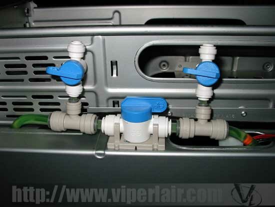 Swiftech ships the system with a 75%/25% water/propylene glycol (green antifreeze, NOT the red Dexcool stuff) solution. I like to go one step further and add Water Wetter to the mix to get the maximum cooling effect. The pump, as mentioned, is controlled by a relay that connects to one of your molex plugs. When the system power is turned on the pump comes on as well. A very handy setup. The power for the pump comes into the case via a standard computer plug like the one that connects to the back of your power supply.