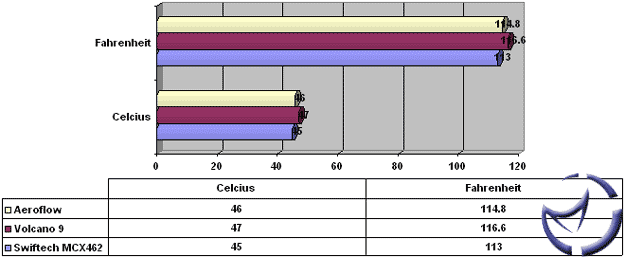 With the Smart Fan 2 spinning at full speed, the Swiftech barely squeezes by the Aeroflow, which in turn manages a narrow victory over the Volcano 9. Going back to the noise argument, although the Smart Fan 2 is moving a lot of air at this speed, it is unbearably loud. The TMD in comparison is a lot more quiet. My conclusion? Using a slower spinning fan, the Vantec Aeroflow manages to hang right in there, which is a testament to its heatsink design.