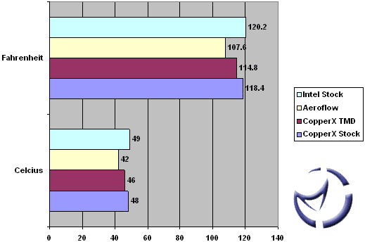 By pushing the CPU, this is where we determine if the heatsink is up to the task. All the heatsinks keep things under 60C, with the Aeroflow leading the pack by a wide margin. The CopperX shows an improvement with the TMD fan, but still can't touch the Aeroflow.