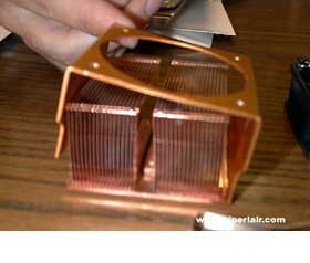 Despite being the same colour as the heatsink, the shroud, where the fan attaches itself to, is not made of copper. It's an aluminum shroud has been anodized to a copper shine. Other than securing the fan, the shroud should assist in directing the airflow, which by default is directed into the heatsink.