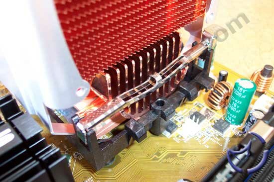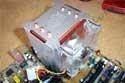 Another problem we found was despite the tapered bottom of the heatsink (for clearance reasons), the Hyper 6 will not fit on an Albatron 875P because of the motherboard's Northbridge heatsink interfering with the setup. Although I was not able to test it on more motherboards, I am fairly certain that any motherboard with a large Northbridge (NB) heatsink within the vicinity of the socket will run into the same problem. You can shave the NB heatsink if necessary, but out of the box, this was the problem we ran into.