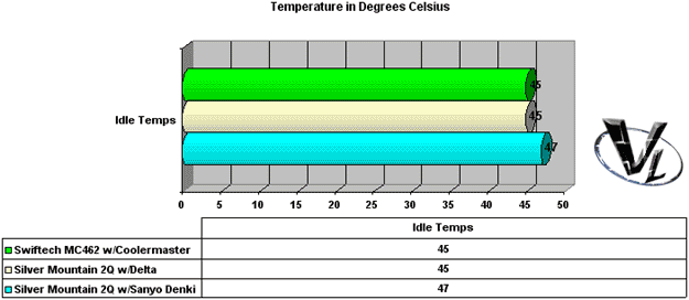 The side of the case is off because the case temperatures climb way to high with it on (I really need a new case). I tested the Silver Mountain 2Q against the Swiftech MC462 with an 80mm 4000rpm Coolermaster fan for comparison purposes. I tested with the Shin Etsu TIM's on both coolers and each cooler was allowed 24 hours to let the TIM "settle". For idle purposes, from a cold boot and into windows for 15 minutes, and for load purposes Quake III Arena was run in a looping demo for an hour.