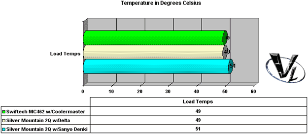 After looking at the results you can see the Silver Mountain 2Q is a very strong performer, coming within 2 degree's of the Swiftech. It hasn't beaten it, but it was never designed for that. It was designed for quiet cooling and with that in mind the Silver Mountain 2Q does very well indeed. As for the actual noise of the HSF, my Enermax PSU 92mm Fan at full RPM is just slightly louder. The noise from the Silver Mountain 2Q is slightly quieter than my Swiftech with the Coolermaster fan (though the pitch is also higher). One of the best things about using the 80mm heatsinks is that you can use a low RPM (and therefore low noise) fan and still have good results. The Silver Mountain 2Q uses a 60mm Sanyo Denki fan but still doesn't sound any louder to me than the Coolermaster 80mm fan. As for its use with the Delta, as you can guess that was very loud, and defeats the entire purpose of this package entirely. The performance though is on par with the Swiftech.