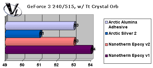 Both the new version of the Nanotherm Epoxy and Arctic Alumina Adhesive slightly improve upon the previous version of the Nantherm Epoxy I used before. I had some problems applying the epoxies (both of them), which may contribute to the difference between those and the Arctic Silver 2. For the record, if you're the type to try out a bunch of GPU heatsinks, I think these epoxies would be better suited for things such as ram chips, motherboard chipsets, or for attaching anything you don't intend to remove often. Even though I diluted the mixtures, they were freaking hard to get off. Had I not done so, it may have improved the performance, but I never would have gotten the Crystal Orb off.