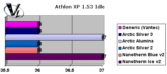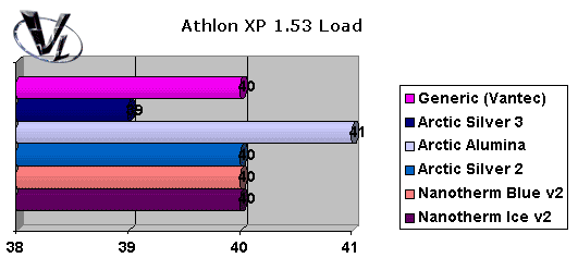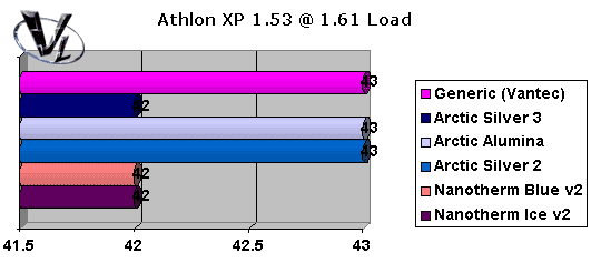 Allowing for a break-in period, we notice that temperatures seem to get lower by about one degree for all the compounds. I was a bit wary about this, as one degree falls within our margin of error, so we'll hold judgement until we view the Athlon XP results.