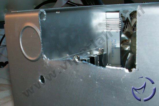 So I stripped the case of components, laid it on its side and whipped out the jigsaw … which promptly died on me after a few seconds. Breaking out the hacksaws was the only other option (if anyone finds my rotary tool I'll be eternally grateful) and of course I had no spare blades. Again after a few seconds the blade broke reducing its length and my stroke to half. About an hour and a lot of cursing later (since someone has also walked off with my metal file too …) I was left with this rather ugly and dangerous looking hole. I then had to enlarge this to compensate for the lack of a file, making it bigger than the Vapochill unit's hole. Why didn't I go to the shops and buy a new file and some blades? Because Murphy's Law states that since on the day I started this all the shops shut half day in the afternoon … Anyway, after hacking out the hole and drilling the four holes required, I had the case ready for mounting and luckily I had some Akasa Pax Mate left over from another case. This was used to line the bottom of the case and cover up my DIY nightmare.