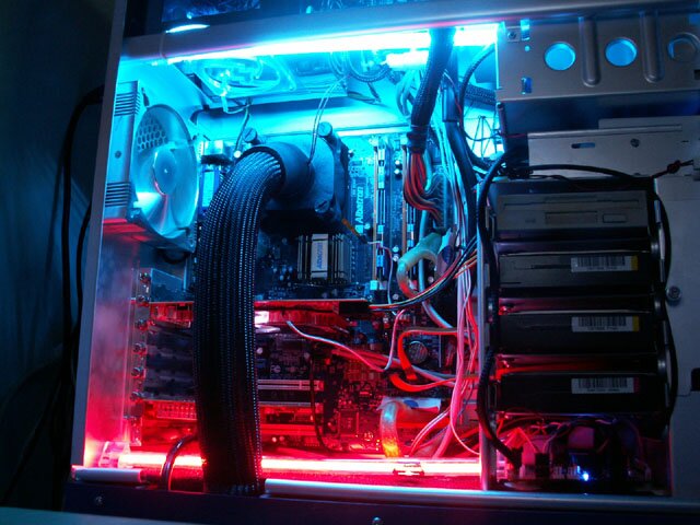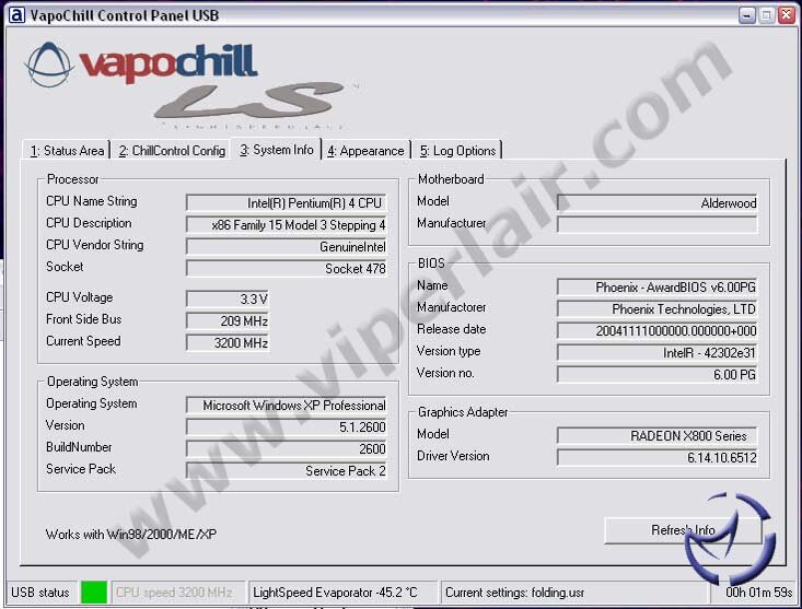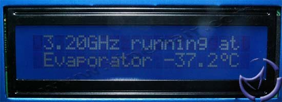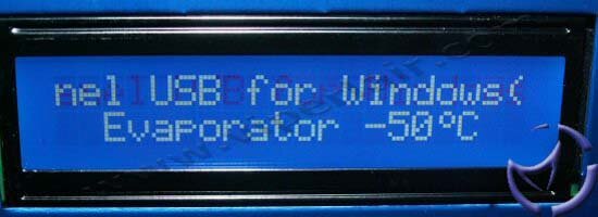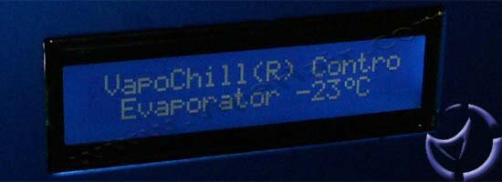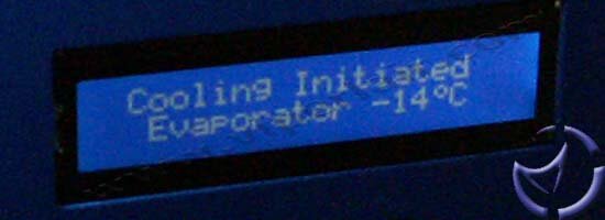 Ok, so holding power for a second and letting go begins the startup procedure. The compressor will kick in and the LCD will start counting down the temperatures from the probe mounted near the evaporator head. Since the start up temperature for the PC is at -10°C by default, you will have to wait about 45 seconds before the PC is powered up. All being well, the system will power on. While you're waiting for your OS to boot you can always amuse yourself by watching the rapidly falling temperatures on the LCD display. The bottom line on the display will show the evaporator temperature and the top will 'ticker tape' scroll the message 'Waiting for USB Link'. Should you power down the system for any reason, as long as you power up while the unit is still cold, the ChillControl will check the temperature is at or below the dictated startup and power the system almost immediately.