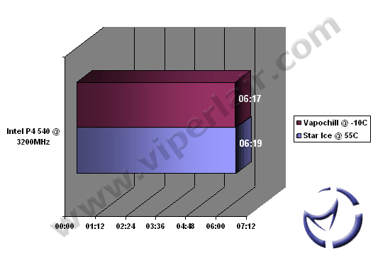 Before we get into the major testing of overclocking the CPU and running a few tests, I thought it might be interesting to quickly show the extra efficiency of a CPU at stock speeds using a Vapochill, in comparison with an everyday heatsink. Now obviously when it comes to cooling performance between a heatsink and the Vapochill there won't be any comparison, however comparing a P4 540 at stock settings under both cooling solutions should hopefully show something. I'm using TMPGEnc and our standard VL test clip, converting an Animatrix file, titled The Second Renaissance Part 1, and a WAV created from VirtualDub. The movie was then converted it into a DVD compliant MPEG-2 file with a bitrate of 5000. Tests were run 3 times and the average calculated. Times are in minutes, seconds, and lower is better.