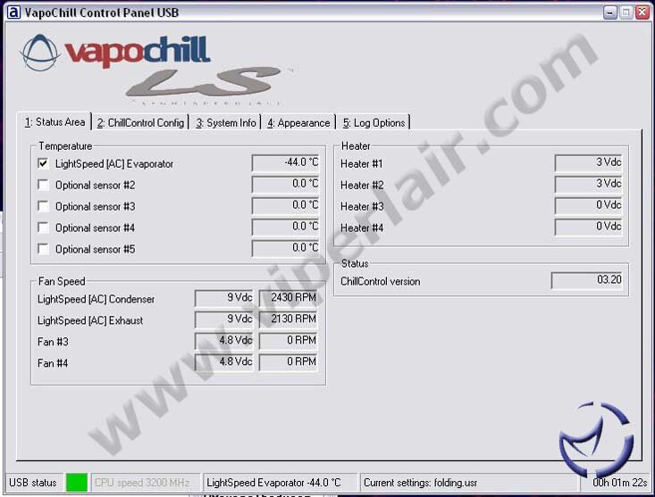 1. Status Area – here you can choose which temperatures out of the 5 are being monitored. The first entry will be taken by the Vapochill Lightspeed itself but if you are using optional temperature probes you can enable them here, as well as see the current fan speeds, heater element voltages and ChillControl Version.