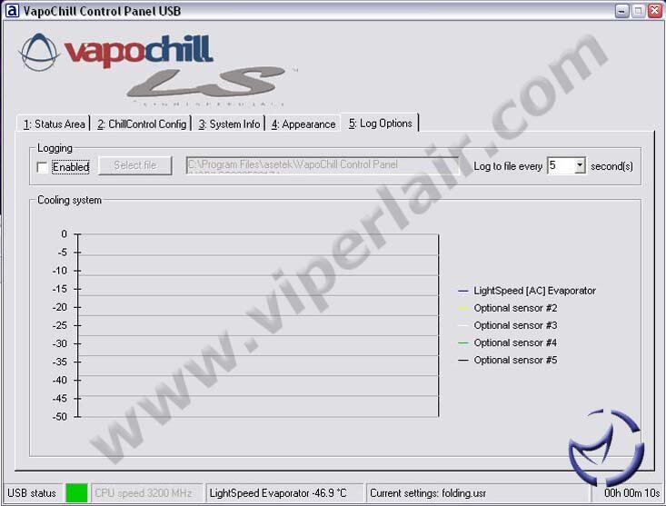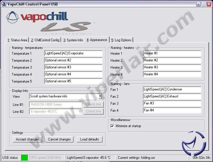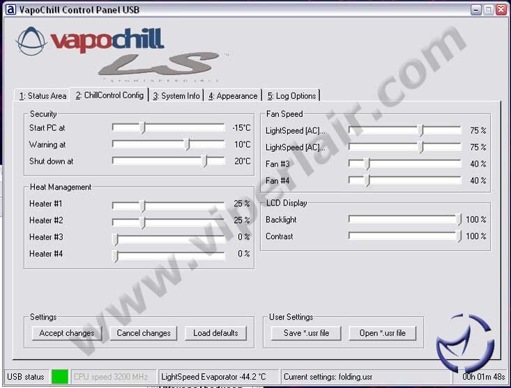 2. ChillControl Config – This is the tab that allows you to control the settings. You can set alarm, shutdown and start temperatures here, as well as fan speeds for up to 4 fans (the first 2 being the Vapochill Panaflo fans), control the heating element voltages and dictate the backlight and contrast of the LCD. All of the settings can reset to defaults with one click and you can even save your own custom configurations.
