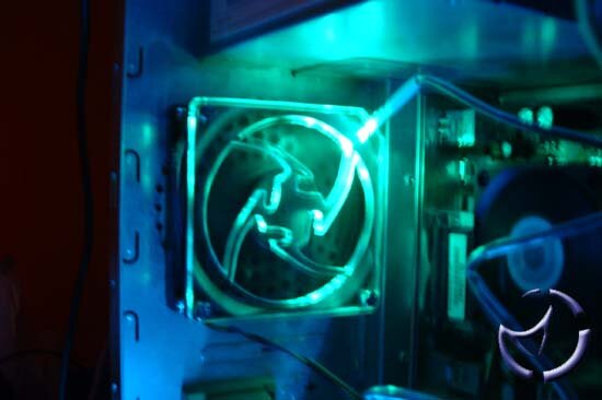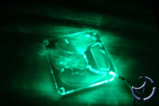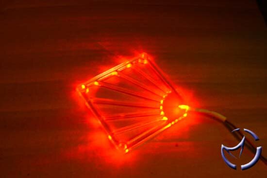The two LED Fan grills I received were of two differing designs, one of the Quake III Arena symbol in red, and the other a design called Blade, which looks like a four spoke shuriken; This one I chose to have in blue. Aero-Glow also sell other designs amongst which are this laser style and the UT "U"logo.