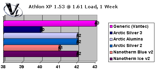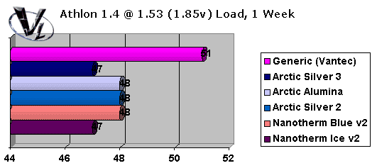 Allowing for a break-in period, we notice that temperatures seem to get lower by about one degree for all the compounds. I was a bit wary about this, as one degree falls within our margin of error, so we'll hold judgement until we view the Athlon XP results.