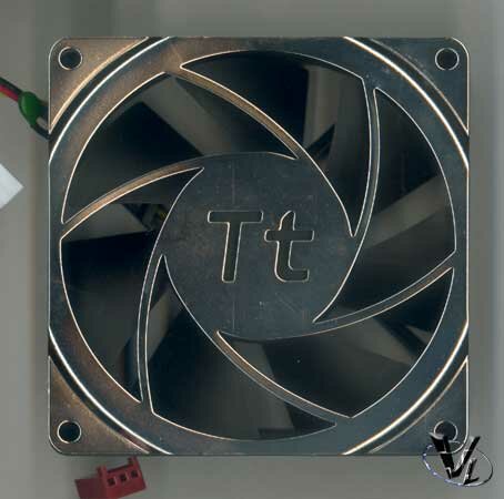Here's a shot of the fan itself, the good ole 80mm Everflow. There are two connectors not pictured here, one for power, and one for RPM monitoring. Thermaltake also includes all the needed screws and 3 to 4 pin adapter in case you don't have enough on your motherboard.