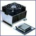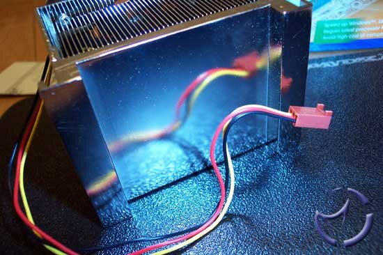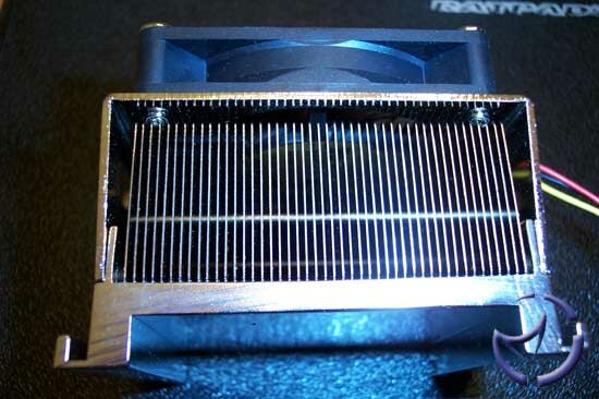 I don't have any specifics about the heatsink/fan combination other than what I can observe. It's a custom job, designed to fit over the PL-P4/N adaper and Northwood CPU. It's a thin fin design, with the base lapped to a mirror finish. The fins are composed of copper, whereas the base is aluminum. A 100% copper construction would probably work better, but that would add to the total cost of the upgrade kit.