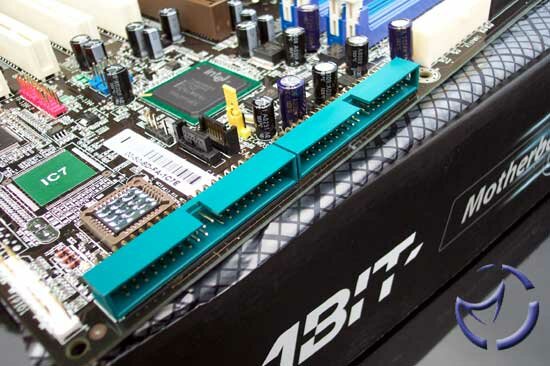 Moving to the right, the power connection is where we like to see it… away from the CPU socket, and at the edge of the motherboard. The floppy connection is right next to it, and it's too bad they didn't align it like they did the IDE cables. Maybe somebody forgot.