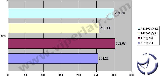 The AI7 performed well in UT2003 tests, outperforming the P4C800-E by just over 1% at overclocked speeds, but trailing at stock speeds by just under 2%.