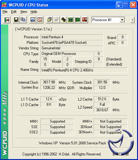 ABIT IC7: Pentium 4 2.4C (12x200: 2.4GHz), 2 x 256MB Corsair TWINX PC3200 Ram, AiW ATi Radeon 9700 Pro, 80GB Western Digital, Windows XP SP1, ATi Catalyst 3.4