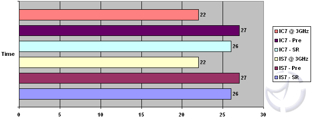 The IS7 continues it's strong showing here, staying within reach of the more expensive IC7. One thing worth pointing out that memory performance is better when at Street Racer, rather than OC'd to 3GHz @ Auto. Other than that, performance trends are in line with those found in SiSoft, so maybe it's time to checkout some real world benchmarks.